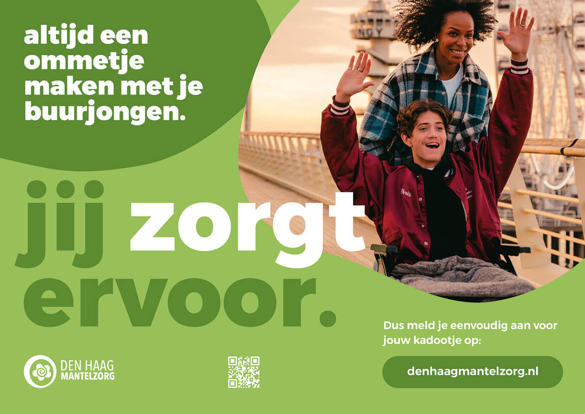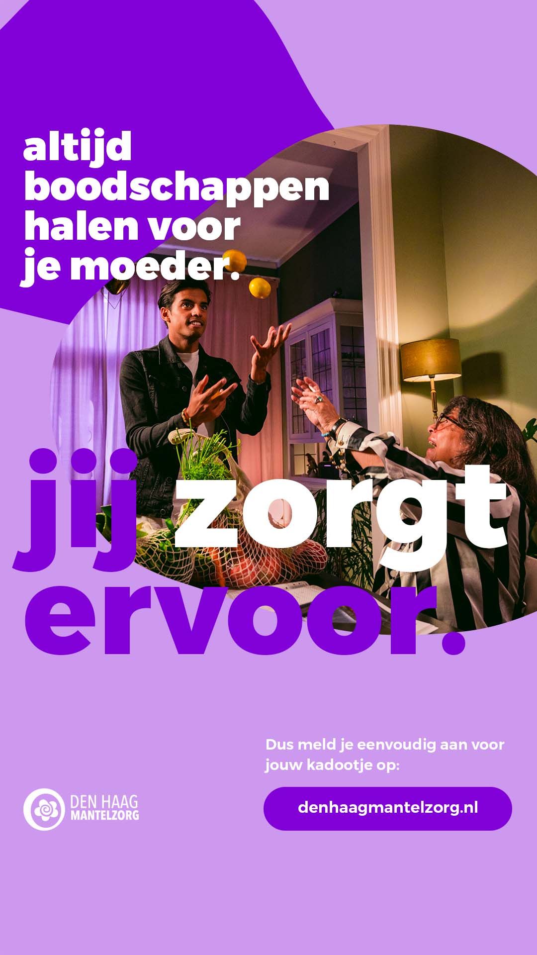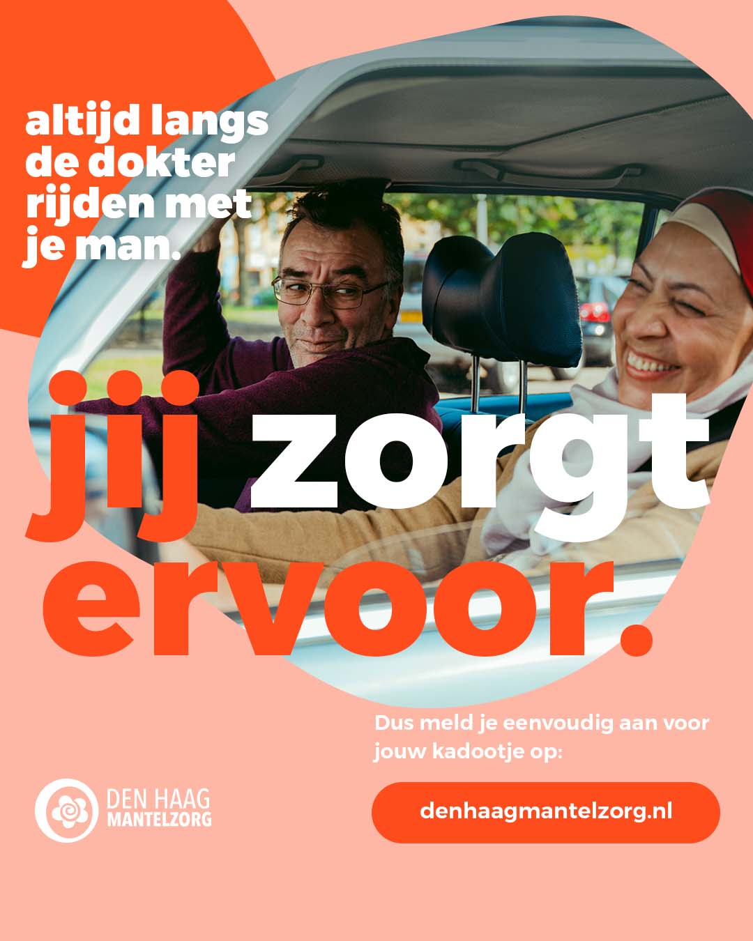 Om meer mantelzorgers te bereiken, lanceren we begin oktober 2021 een campagne. We starten met een bewustwordingsfase waarin we duidelijk maken wat iemand tot een mantelzorger maakt. Daarna volgt de activatiefase waarin we mantelzorgers oproepen zich aan te melden voor een kadootje via denhaagmantelzorg.nl